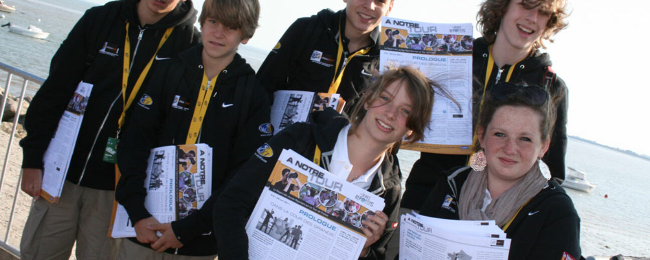 Il leur a aussi permis de concevoir déjà un premier numéro. Aux Herbiers, les rotatives d’A notre Tour ont tourné à fort régime pour sortir la première des dix éditions de ce petit canard presque quotidien. Pas question de perdre de temps, car le rythme va s’intensifier progressivement avec les premiers transferts de ville en ville. En attendant, ce ne sont pas les sujets qui manquent, vous le constaterez par vous-même dans les deux pages qui constituent ce premier numéro grand format, qui représente pour Anne-Laure, Dylan, Perrine, Pol, Rémi et Théo un baptême dans le milieu du journalisme. De premiers pas prometteurs pour cette joyeuse bande d’ados prête à partir à l’assaut des trois semaines du Tour de France.