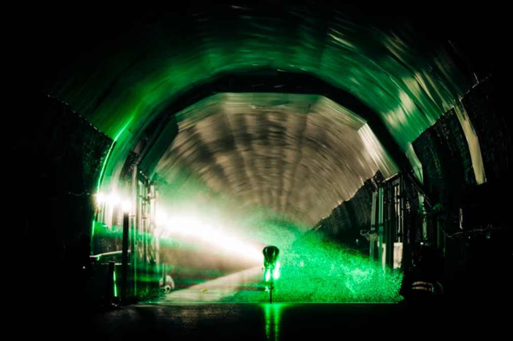 Le test exigeait une concentration totale : plus de 100 passages à vitesse, position et trajectoire identiques, à chaque fois à travers un rideau vert de bulles d’hélium et de lumière laser. Le tunnel de Catesby, avec sa température constante et l’absence d’influences extérieures, offre un environnement idéal pour ce type d’expérience.