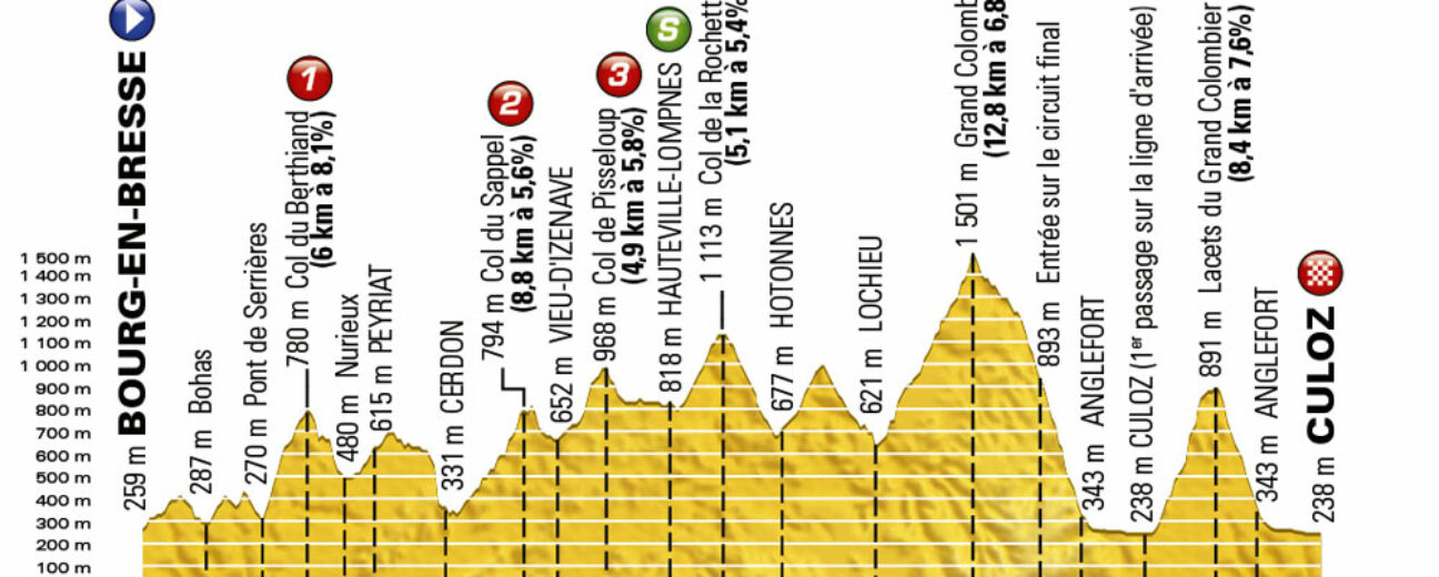 « Ce n’est pas une étape très longue, 160 kilomètres dans l’Ain entre Bourg-en-Bresse et Culoz, mais elle présente un profil très dense avec très peu de portions de plat. Ce sera un enchaînement de cols et de côtes, de montées et de descentes, pour aller chercher la principale difficulté du jour : le col du Grand Colombier (12,8 km à 6,8 %). Du sommet, kilomètre 113, on descendra une première fois sur Culoz, où l’on passera sur la ligne à 23,5 kilomètres de l’arrivée. Avant d’effectuer une boucle finale qui repassera par le Grand Colombier. Par les lacets (8,4 km à 7,6 %).