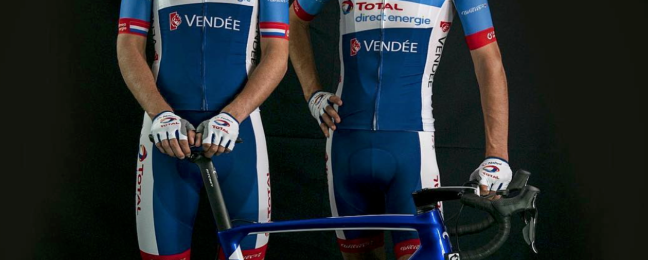 Changement de couleurs pour la formation vendéenne. Voici les nouvelles couleurs de l’équipe de Jean-Réné Bernaudeau, du bleu, du blanc, et du rouge. A la Française. Lilian Calmejane et Niki Terpstra sont fiers et tout sourire avec leur nouveau vélo Wilier. La Direct-Energie change donc de nom et devient la Total Direct Energie.