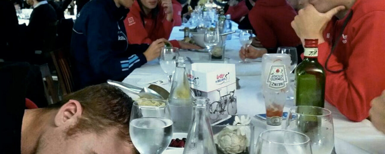 Dur, dur, la reprise des entraînements intensifs… Dans un mois, Adam Hansen sera des coureurs qui ouvriront la saison au Tour Down Under. Pendant dix jours, les sorties se sont donc enchaînées sur l’île de Majorque, où était rassemblée l’équipe Lotto-Belisol. Grand déconneur, Adam Hansen a repris ses bonnes habitudes. Un an après avoir réalisé une série de clichés caricaturant la fatigue accumulée au fil des jours d’entraînement, le rouleur australien revient avec le plein d’idées comiques. Ce soir-là à table, peut-on dire qu’il n’est visiblement pas dans son assiette ?!