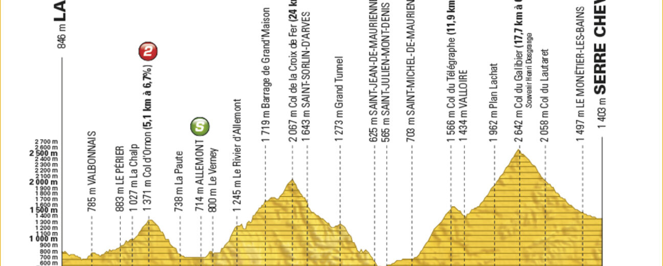 Le col d’Ornon (5,1 km à 6,7 %) après 25 kilomètres d’échauffement marquera le début des choses sérieuses avant l’enchaînement de deux cols Hors Catégorie. La course grimpera d’abord le long col de la Croix de Fer (24 km à 5,2 %) par Le Verney, ce qui la portera pour la première fois au-dessus des 2000 mètres d’altitude : 2067 mètres.