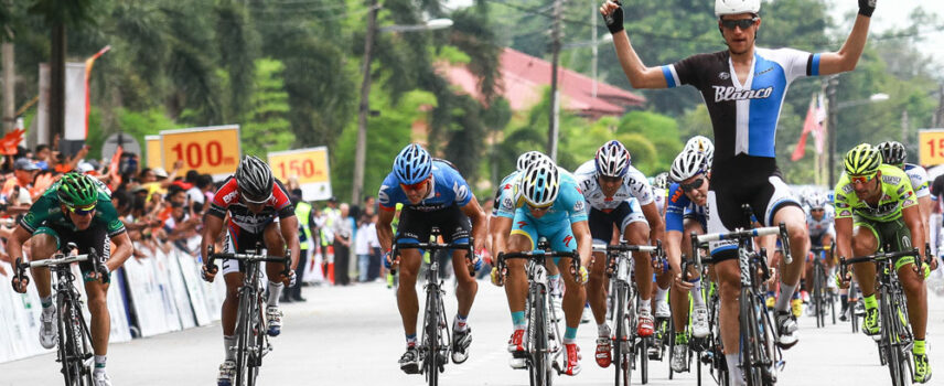 Tour de Langkawi # 1. Au sprint, le triple champion du monde de vitesse Theo Bos bat Bryan Coquard et Andrea Guardini à l'arrivée de la première étape.