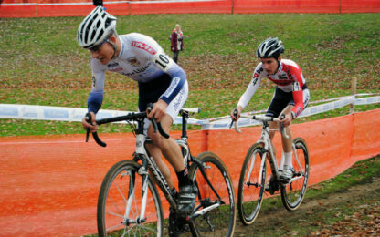Challenge National Espoirs # 2 à Rodez. De la masse de coureurs candidats au titre chez les moins de 23 ans, Julian Alaphilippe se démarque. Il repousse Venturini.