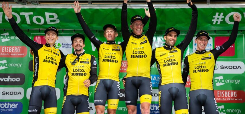 Grâce à sa victoire sur le contre-la-montre, la LottoNL Jumbo récupère le maillot vert de leader du Tour de Grande-Bretagne. Primoz Roglic en hérite. Julian Alaphilippe, deuxième du général, est pointé à six secondes