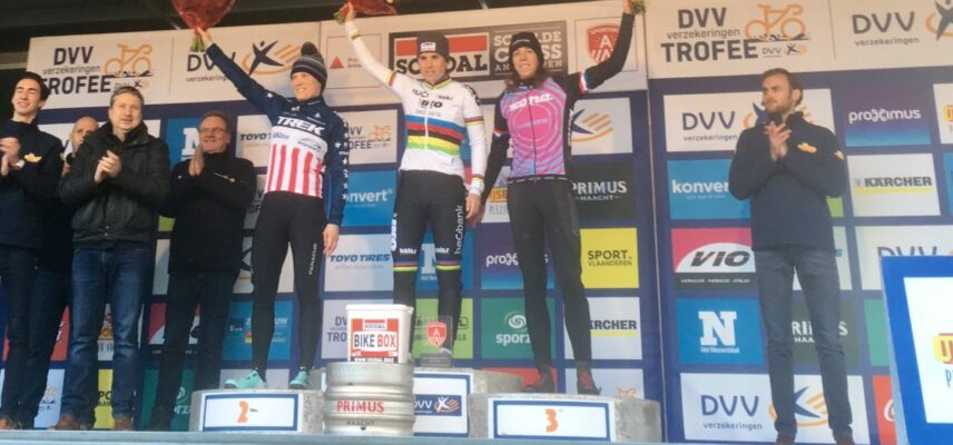 Sanne Cant et Mathieu Van der Poel s'imposent une nouvelle fois sur une manche du DVV Trofee, lors du Scheldecross à Antwerpen, en Belgique. Compton et Van Aert sont deuxièmes, Wyman et Sweeck terminent à la troisième place.