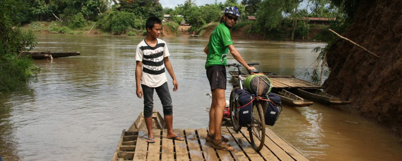 La suite de notre progression pourrait s’apparenter à un enchaînement sans fin. Ce ne sont que les flaques d’eau qui nous obligent à poser pied à terre et à pousser les vélos si nous ne voulons pas rester embourbés. Nous nous exclamons à haute voix : « ce serait bien si nous pouvions rouler 30 minutes sans nous arrêter ». Aussitôt dit, aussitôt arrêtés devant un cours d’eau tumultueux. Au premier coup d’œil, il est impossible de passer, le courant est trop fort. Il y a du désarroi en nous, de la déception même, jusqu’à ce que nous dénichions une passerelle cachée dans la végétation. Elle nous permet de franchir cette rivière en étant face à une cascade de 40 mètres de large. Ce pont suspendu est mémorable. Un maillage en câble de 10 millimètres et des morceaux de bambous, tenus par du fil de fer (lorsqu’il y en a), constituent ce passage au-dessus des eaux. C’est léger et c’est 100 % lao. Cela nous rappelle le Népal… en pire ! Nous travaillons notre équilibre. Un vélo en main, un pied qui manque de riper sur un bambou qui prend la fuite cinq mètre plus bas. De l’autre côté, le scénario continue. Nous parcourons seulement 500 mètres pour devoir franchir cette fois ci une étendue de 200 mètres de long. L’eau nous arrive encore à mi-cuisse. Il est 18h00. Il va falloir faire vite si nous voulons traverser et trouver un coin pour poser la tente avant la nuit.