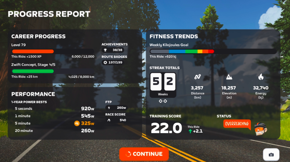 Zwift déploie également un tout nouvel écran « Progress Report ». En s’appuyant sur le succès du suivi de forme de Zwift, les Zwifteurs peuvent désormais suivre leurs progrès après chaque sortie. Sur l’écran mis à jour, les cyclistes voient la progression de leur objectif hebdomadaire, leurs totaux de séries (streaks), leur score d’entrainement et leur statut. Le score d’entrainement représente la charge d’entraînement (intensité, durée et fréquence) sous la forme d’un indicateur facile à suivre. Les objectifs hebdomadaires sont définis en kilojoules, points de stress, calories, distance ou temps. Le statut est affiché selon le classement suivant : Prêt, En forme, Productif, Surentrainement et Désentrainement.