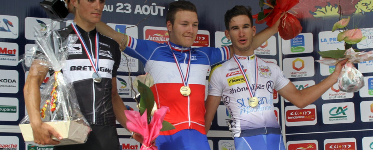 Trois jours plus tôt, on avait vu l’Auvergnat Rémi Cavagna, du Team Pro Immo Nicolas Roux, endosser lui aussi un maillot bleu-blanc-rouge, celui du contre-la-montre, quand au terme d’un effort solitaire de 25,3 kilomètres il avait repoussé Marc Fournier (Picardie) à 34 secondes et Nans Peters (Rhône-Alpes) à 37 secondes. Un premier titre majeur pour ce rouleur de 20 ans médaillé d’argent l’an passé à Saint-Omer et 2ème du Chrono des Nations Espoirs aux Herbiers. 8ème temps des Championnats d’Europe de Tartu, Rémi Cavagna avait remporté deux chonos cette saison au Tour des Cantons de Mareuil-Verteillac-Riberac puis au Tour d’Auvergne.