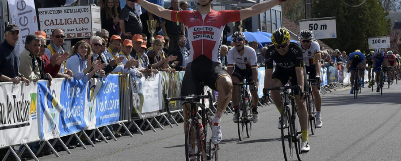 Tour du Loir-et-Cher # 1. Comme un signe annonciateur, le porteur du dossard 41 s’est imposé hier à Nouan-le-Fuzelier au terme de la première étape du Tour du Loir-et-Cher ! Michael Goolaerts (Lotto-Soudal Espoirs), puisque c’est de lui dont il s’agit, a réglé au sprint le peloton qui sera revenu sans difficulté sur les trois échappés du jour : l’Irlandais Conor Dunne (JLT Condor), son compatriote Jack Wilson (An Post-Chain Reaction), et l’Allemand Kersten Thiele (Allemagne). Sortis après la côte de Dhuizon au 70ème kilomètres, les trois échappés auront vu leur avance plafonner à 5’45 » avant d’être rejoints par le peloton peu avant le dernier tour de circuit dans les rues de Nouan. Au sprint, chahuté par une chute, Michael Goolaerts aura alors battu Christopher Lawless (JLT Condor) et Leif Lampater (Allemagne) pour s’emparer du premier maillot jaune de leader du classement général.