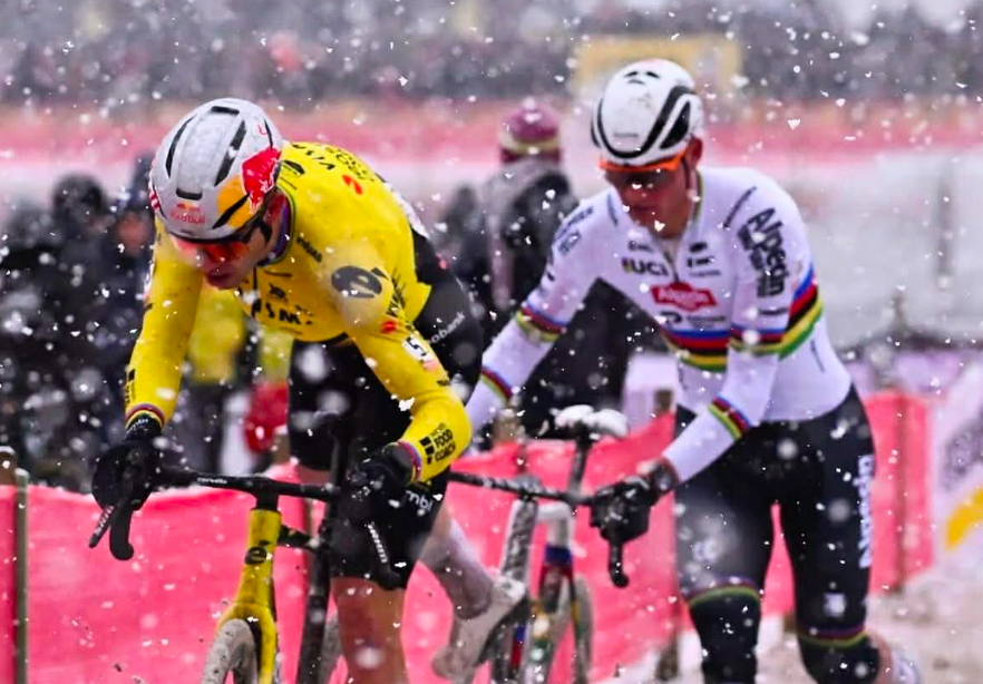 Sous la neige, Mathieu van der Poel a remporté l’Exact Cross de Mol tandis que Wout van Aert a abandonné sur chute.