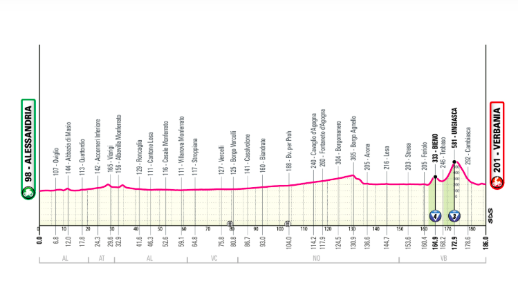 Quelques ascensions en début de parcours (Colle Giovo/Bric Berton) avant d’entrer dans la plaine du Pô et de filer vers une probable arrivée au sprint.