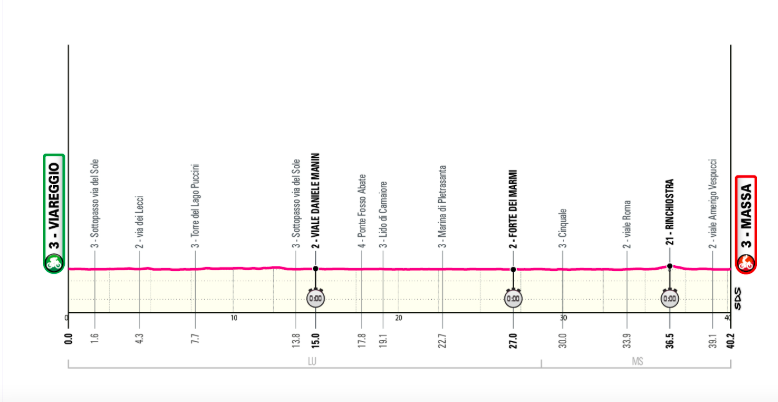 Contre-la-montre complètement plat et certainement très rapide (prévisions autour de 56/57 km/h). Les 10 premiers kilomètres comportent plusieurs virages autour de Viareggio et Torre del Lago Puccini, puis la route longe le bord de mer en ligne droite et les meilleurs pourront atteindre 60 km/h.