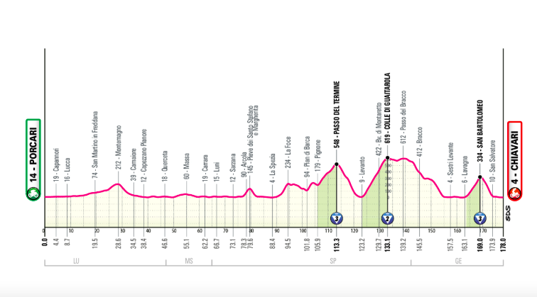 Étape vallonnée avec une deuxième partie exigeante au passage dans les Cinque Terre (Levanto) et une dernière montée redoutable peu avant l’arrivée.