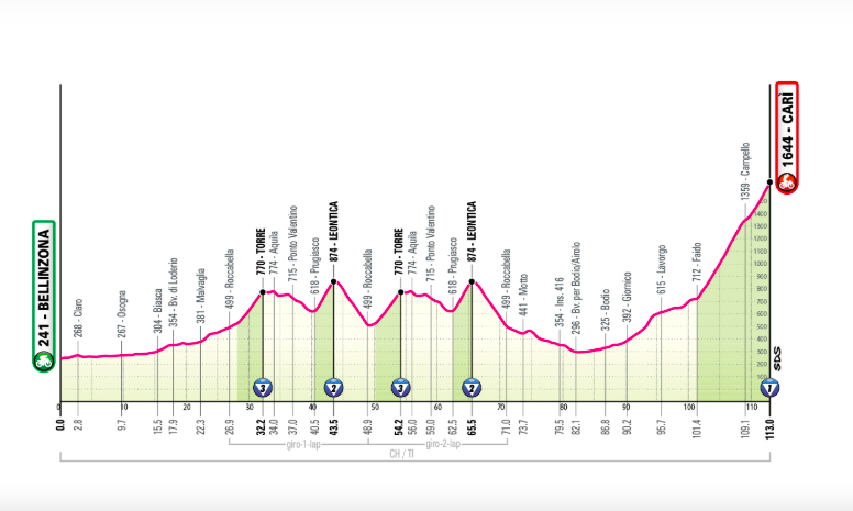 Étape très courte (113 km) avec un dénivelé conséquent (3.000 m). Le peloton affronte un circuit avec deux montées exigeantes (Torre et Leontica), avant une arrivée sèche à Carì.