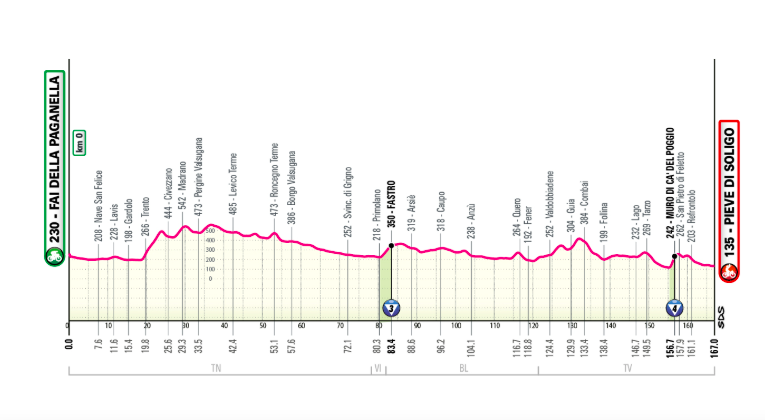 Étape légèrement vallonnée. Descente vers le km 0, avant un enchaînement de montées et descentes, à la difficulté modérée. Le célèbre “Muro” di Ca’ del Poggio à 9 km de l’arrivée fera la décision : emballage massif ou peloton morcelé ?