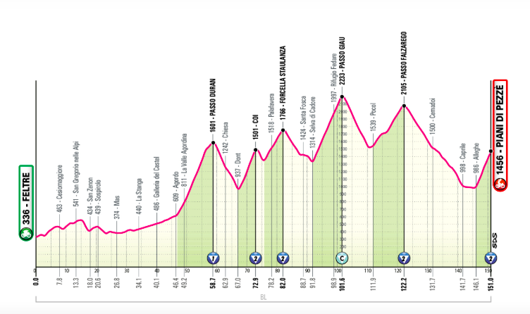 Grande étape des Dolomites, traditionnelle de par les ascensions empruntées, moderne en raison de sa distance. Les coureurs affronteront les ascensions de Duran, Staulanza (avec le versant de Coi [19%] emprunté en 2023), Passo Giau par son versant le plus dur, Passo Falzarego et la course ascension finale (5 km à près de 10%, avec un maximum de 15%).