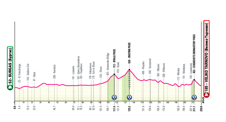 Étape avec quelques ascensions dans la partie centrale pour franchir la chaîne de montagnes qui traverse la Bulgarie et final avec une montée à quelques kilomètres de Veliko Tarnovo (monastère de Lyaskovets, environ 3,5 km à 7,5 % avec long passage à 10% dans la première partie).