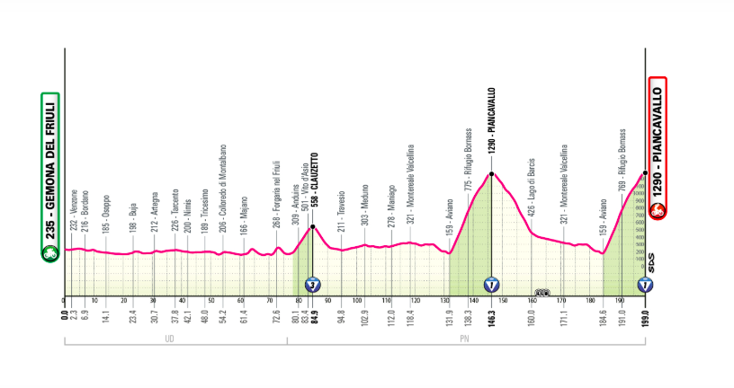 Étape vallonnée dans la première partie, avant la double ascension du Piancavallo dans le final. La course visite le cratère du tremblement de terre dans le Frioul du 6 mai 1876 (990 victimes et des dizaines de milliers de personnes déplacées) avant de grimper à deux reprises le Piancavallo avec un circuit à proximité du lac de Barcis. Pantani s’y est également imposé en 1998, avant de conquérir le Giro.