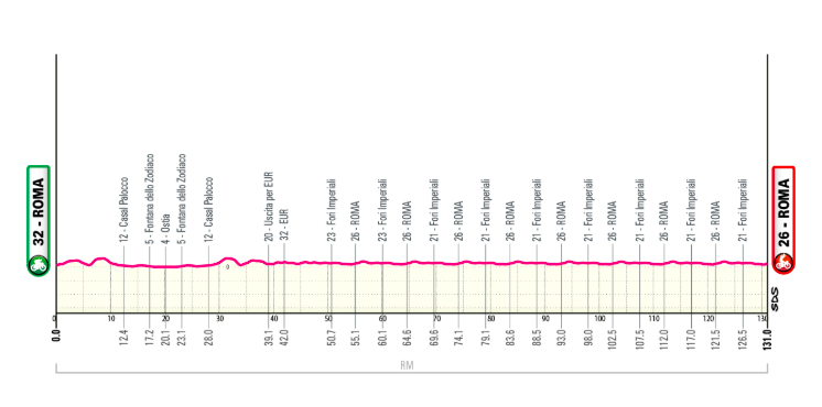 Étape gala similaire à celle des dernières années, avec un aller-retour jusqu’au littoral à Ostia avant d’arpenter le circuit final en ville.