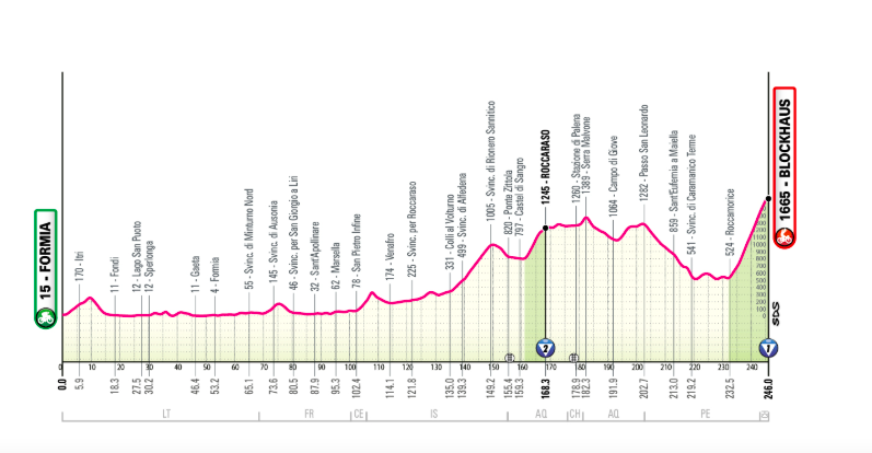 Première arrivée au sommet. L’étape la plus longue du Giro avec ses 246 km. Le début de l’étape longe la côte du Latium, passant par Sperlonga et Gaeta, avant de rejoindre les Abruzzes. L’ascension vers Blockhaus commence à Roccamorice, le versant le plus difficile, avec ses 10 derniers kilomètres à une pente moyenne d’environ 10 %, dépassant parfois ce pourcentage.