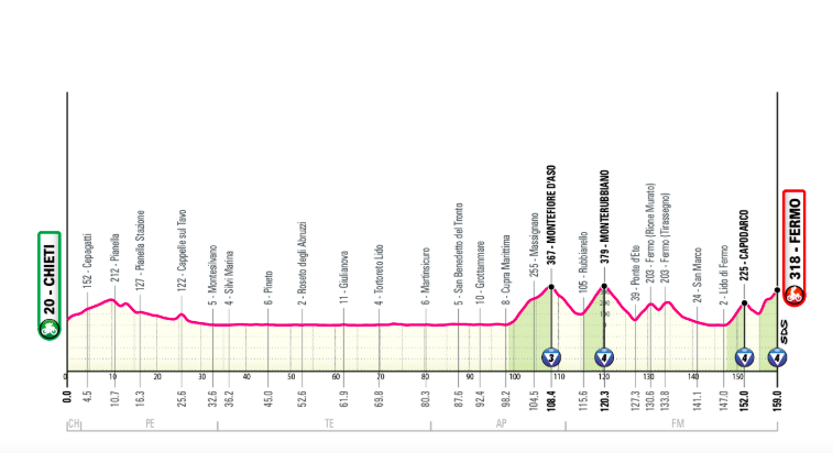 Étape éprouvante avec un enchaînement de “murs”, façon Tirreno-Adriatico. Première partie sur la côte adriatique, puis dans l’arrière-pays avec plusieurs murs à gravir, dont celui de Capodarco, théâtre d’une célèbre course U23, puis arrivée dans le centre avec un autre mur à franchir.