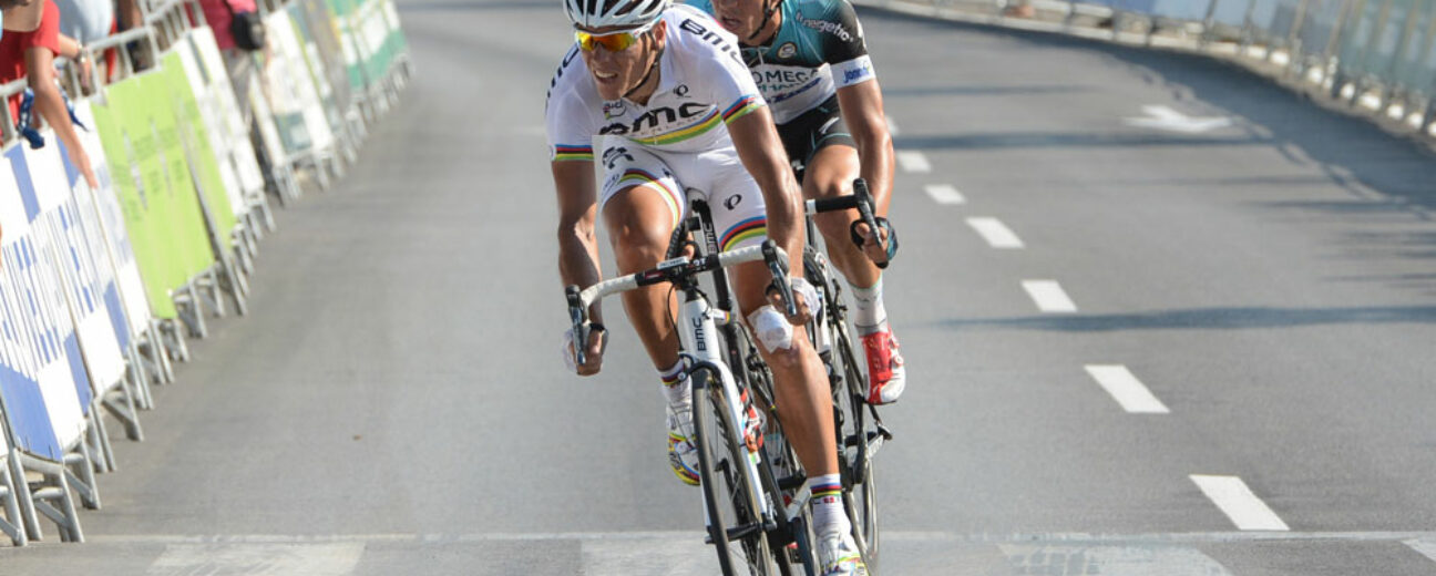 Philippe Gilbert. Philippe Gilbert (BMC Racing Team) parviendra-t-il à gagner une course ceint du maillot arc-en-ciel ? Il faut remonter à Luc Leblanc en 1995 pour retrouver trace d’un champion du monde resté sans victoire l’année de son règne. Hier encore, c’est la 2ème place qu’a prise le Wallon. « Je vis cette Vuelta au jour le jour en essayant de profiter des étapes qui me conviennent, a-t-il dit. Le circuit final était tortueux et proposait des routes étroites, il n’y avait qu’une trajectoire et j’ai profité d’une moto pour sortir du peloton avec Zdenek Stybar. Lui et moi avons bien collaboré et il mérite sa victoire. Il a lancé le sprint et je ne l’ai remonté que sur la fin mais pas assez. Je suis déçu du résultat, la victoire me manque, mais je suis enfin satisfait de mes sensations après ma chute dans l’Eneco Tour. »