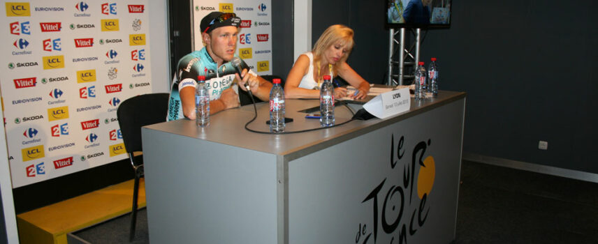 Pascale Lora Schyns approche tous les acteurs de la Grande Boucle, retranscrit pour les médias leurs mots, leurs confidences, leurs émotions. Elle est interprète.