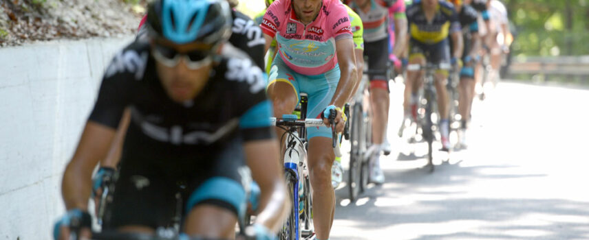 Giro # 8. Alex Dowsett remporte le long contre-la-montre. Loin de dominer les débats, Bradley Wiggins ne prend que onze secondes à Nibali qui endosse le maillot rose.