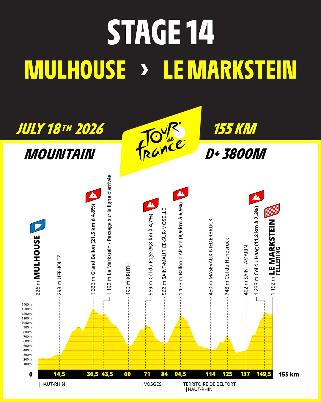 Cette remontée du pays en diagonale suivant un cap nord-est fixe des rendez-vous de montagne dans le Cantal avec une arrivée au Lioran (10e étape), puis dans le Jura et les Vosges. Après deux semaines de course, le week-end de tous les possibles se présente pour une prise de pouvoir musclée : le Markstein, que les coureurs atteindront après avoir souffert dans l’inédite montée du Haag (14e étape) pourrait se révéler aussi décisif que le Plateau de Solaison (15e étape), dont le baptême du Tour aura lieu juste après la montée au Salève.
