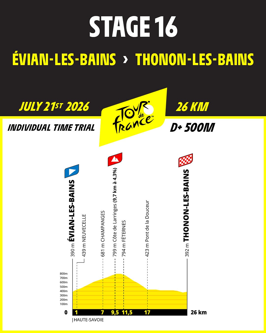 L’unique contre-la-montre individuel aura pour cadre le Lac Léman (16e étape) et pourrait rebattre les cartes, en vue d’un triptyque alpin en forme de bouquet final. Le Maillot Jaune ne sera peut-être pas inquiété à Orcières-Merlette (18e étape), mais devra rester sur ses gardes et résister dans le duo d’étapes à l’Alpe d’Huez concocté cette année (19e et 20e étapes). Aucun itinéraire n’aura approché les 5 000 mètres de dénivelé jusque-là, le trajet dessiné depuis le Bourg d’Oisans en comprend 5 600, en passant par les cols de la Croix de Fer, du Télégraphe et du Galibier, avant de s’attaquer à la station iséroise en empruntant le col de Sarenne.