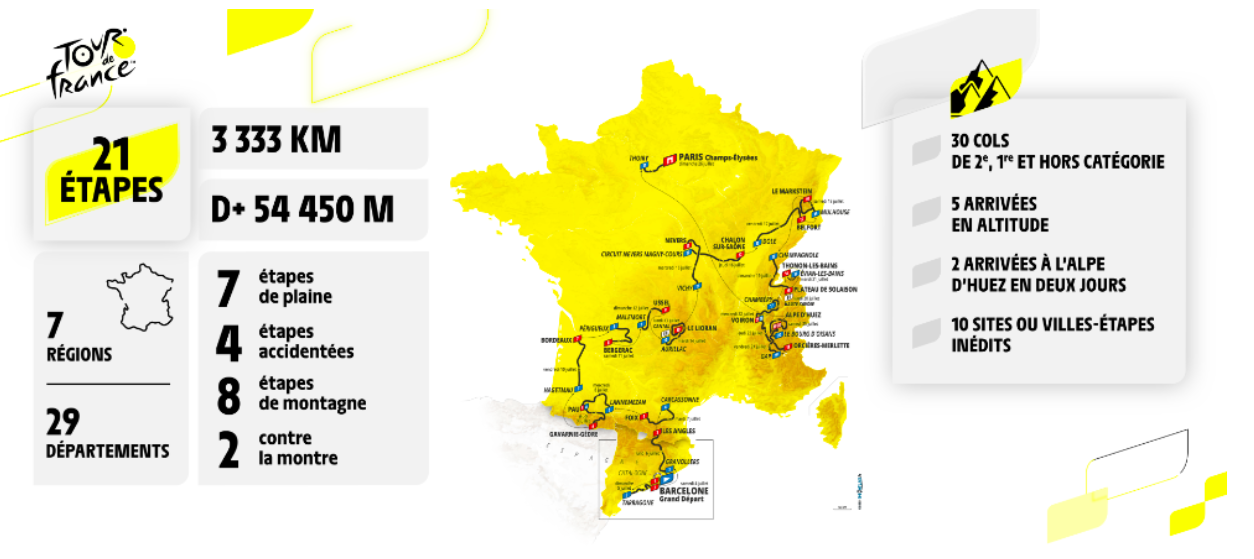 Le programme préparé pour les coureurs du Tour de France entre le 4 et le 26 juillet prochains a été dévoilé devant plus de 3 500 spectateurs au Palais des Congrès de Paris. Après le Grand Départ de Barcelone, les cinq massifs montagneux du territoire français seront visités : les Pyrénées, le Massif Central, le Jura et les Vosges précéderont un final alpin sous haute tension au moment d’une double arrivée à l’Alpe d’Huez, incluant une montée inédite par le col de Sarenne à 24 heures de l’arrivée finale à Paris. L’Étape du Tour de France, le rendez-vous majeur des cyclosportifs, sera organisée en 2026 sur le parcours de cet acte II à l’Alpe d’Huez, une semaine avant l’entrée en action des professionnels.