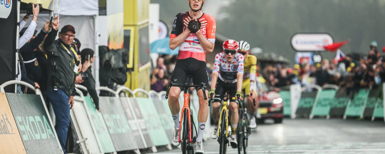 Thymen Arensman (Ineos Grenadiers) profite du marquage entre les deux rivaux pour prendre quelques longueurs d’avance. Le Néerlandais résiste au retour des favoris dans les derniers mètres et décroche sa deuxième victoire sur ce Tour de France. Il devance Jonas Vingegaard et Tadej Pogačar.