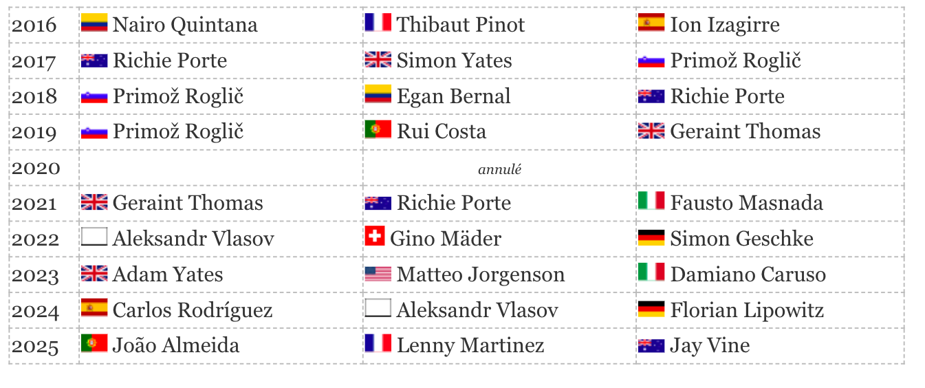 La 79ᵉ édition du Tour de Romandie 2025 a lieu du 28 avril au 3 mai. Les coureurs s’élanceront pour un prologue et cinq étapes à travers la région suisse. Créée en 1947, l’épreuve est inscrite au calendrier UCI World Tour et rapporte 500 points au vainqueur du classement général. L’an dernier, Joao Almeida (UAE Team Emirates – XRG) avait remporté la course devant Lenny Martinez (Bahrain Victorious) et son coéquipier Jay Vine. Cette année, Tadej Pogacar (UAE Team Emirates – XRG) sera au départ du Tour de Romandie pour la première fois de sa carrière et sera le grandissime favori. Primoz Roglic (Red Bull Bora-Hansgrohe), Lenny Martinez, Florian Lipowitz (Red Bull Bora-Hansgrohe) seront également au départ.