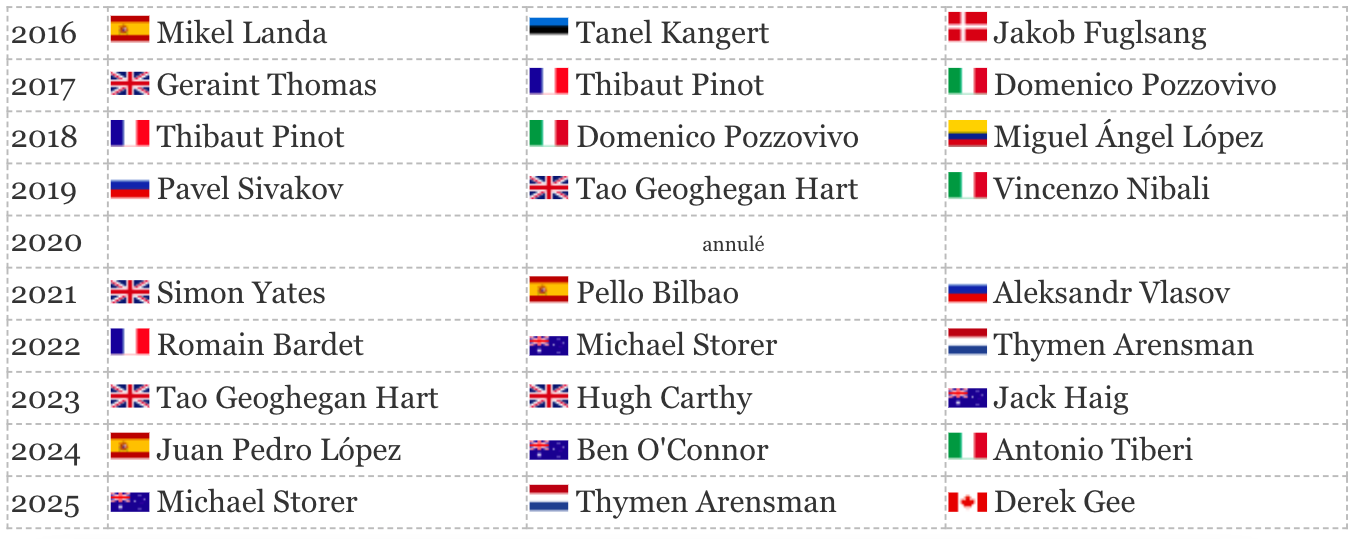 Le Tour des Alpes 2026 a lieu du 20 au 24 avril. Les coureurs s’élaceront pour cinq étapes montagneuses. Créée en 1962, la course par étapes est inscrite au calendrier UCI Pro Series et rapporte 250 points au vainqueur du classement général. L’an dernier, Michael Storer (Tudor Pro Cycling Team) avait remporté le classement général devant Thymen Arensman (Ineos Grenadiers) et Derek Gee (Israel – Premier Tech). L’Australien sera au départ cette année pour tenter de conserver son titre. Tom Pidcock (Pinarello Q36.5 Pro Cycling Team), Egan Bernal (Ineos Grenadiers), Giulio Pellizzari (Red Bull Bora-Hansgroghe) ou encore Thymen Arensman (Ineos Grenadiers) seront également au départ.