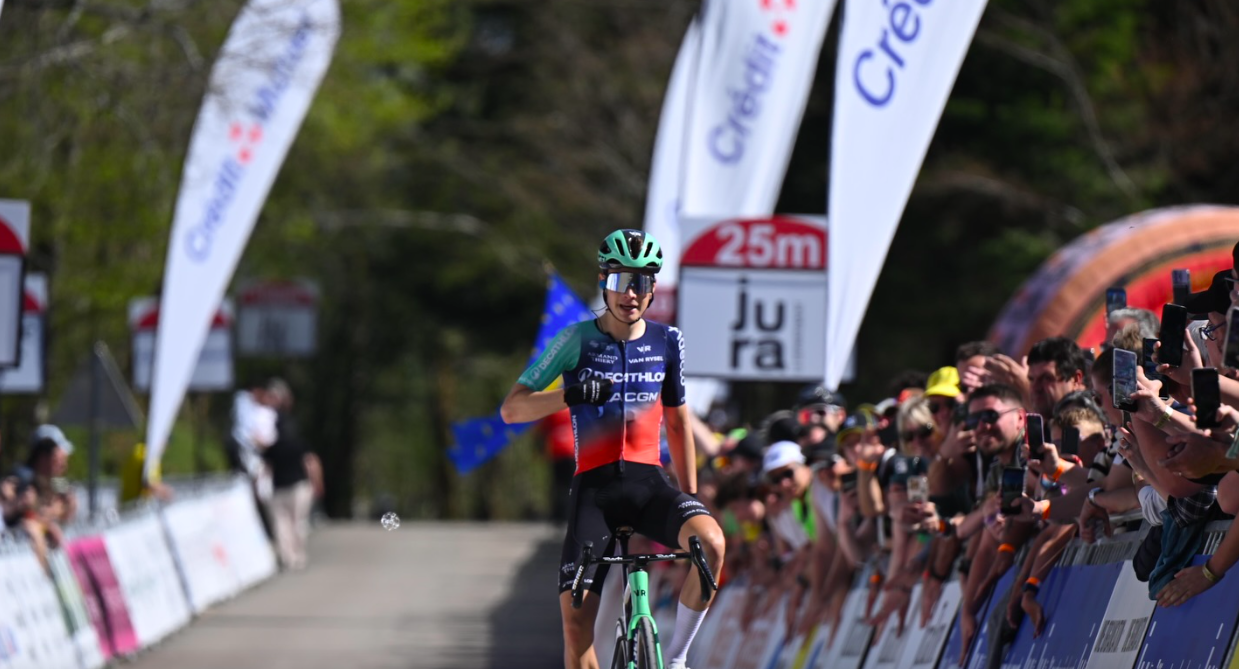 Matthew Riccitello (Décathlon CMA CGM) a remporté, ce samedi, la 23ème édition du Tour du Jura cycliste, sixième manche de la FDJ United Series 2026. Battu hier par Jordan Jegat (TotalEnergies), Matthew Riccitello a fait la diffèrence dès les premiers pourcentages de l’ascension finale du Mont Poupet. L’Américain s’impose et décroche sa troième victoire de la saison. Il devance son coéquipier Léo Bisiaux, qui a devancé Jordan Jegat au sprint.