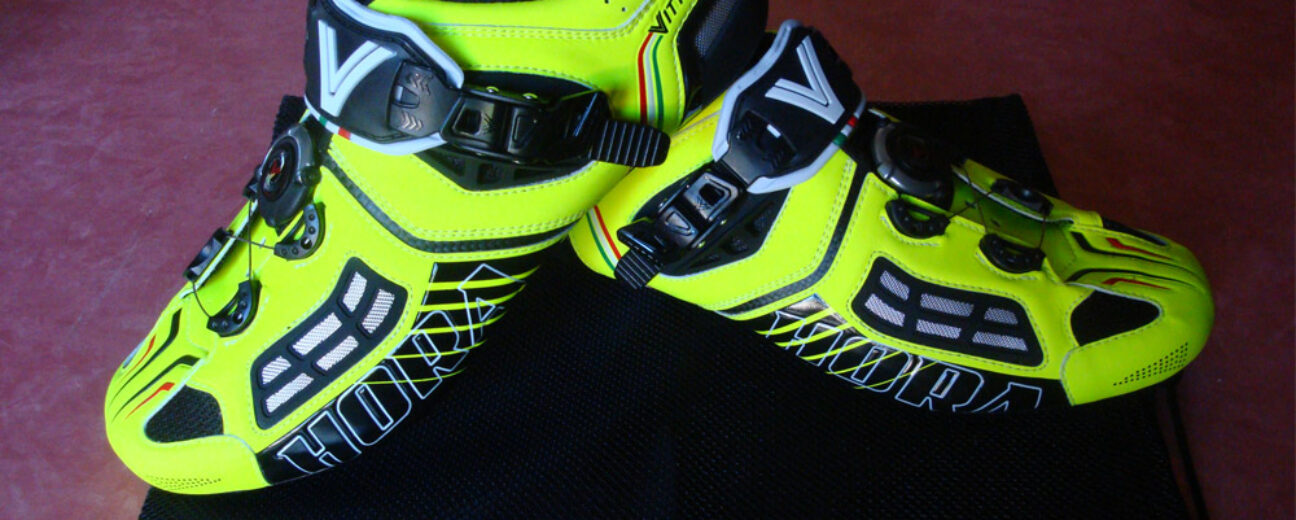 Cette semaine, nous testons la paire de chaussures Hora Evo et son casque V400. Cette paire de chaussures très légère (276 grammes) possède toutes les caractéristiques d’un modèle haut de gamme innovant. Nous avons particulièrement aimé le maintien de la chaussure au pied pendant l’effort. Celle-ci reste totalement solidaire au cycliste. Ceci est rendu possible grâce aux différents systèmes de serrages présents sur la chaussure. Le devant du pied est maintenu par un serrage à câble micrométrique permettant d’ajuster le serrage aux différentes formes de pied et aux ressentis pour un confort optimal.