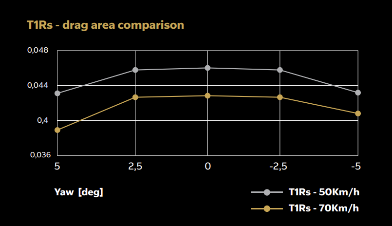 Les T1R ont été conçues pour offrir leurs performances optimales là où cela compte vraiment : à des vitesses supérieures à 60 km/h, le seuil critique où se gagnent ou se perdent souvent les courses sur piste. Grâce à son profil aérodynamique avancé, le T1Rs affiche un coefficient de traînée inférieur à haute vitesse par rapport aux conceptions traditionnelles. Cela ne signifie pas que le coureur dépense moins d’énergie à 70 km/h, mais plutôt que le flux d’air reste plus propre et plus stable, permettant au vélo de maintenir sa vitesse avec une efficacité exceptionnelle. Chaque aspect du T1Rs a été conçu avec un objectif clair : fendre l’air avec une efficacité inégalée. Ses performances exceptionnelles sont le fruit d’une série de choix de conception méticuleux et d’innovations aérodynamiques :
