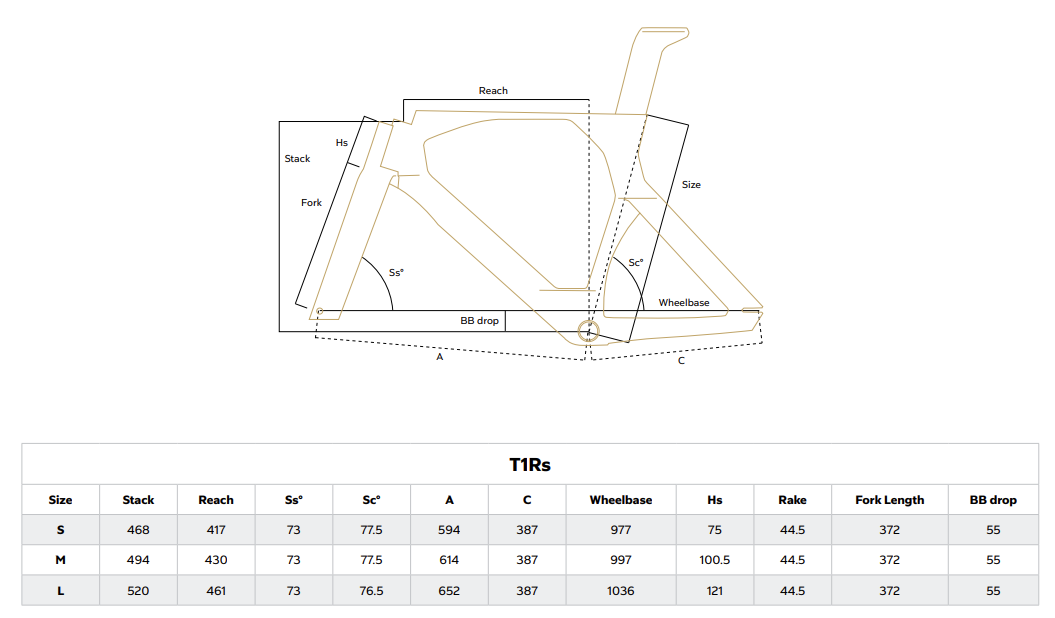 Le T1R est disponible en trois tailles, avec une géométrie soigneusement développée, élément clé du processus de recherche et développement, pour s’adapter à toutes les disciplines sur piste. Les coureurs de poursuite bénéficient d’une position aérodynamique basse, tandis que les pilotes d’endurance et de sprint profitent d’une portée étendue et d’une rigidité exceptionnelle du train avant, même avec des potences longues. L’angle de direction et l’angle de chasse de la fourche sont précisément réglés pour assurer stabilité et contrôle lors des accélérations rapides et des changements de direction brusques, offrant des performances optimales à chaque tour.