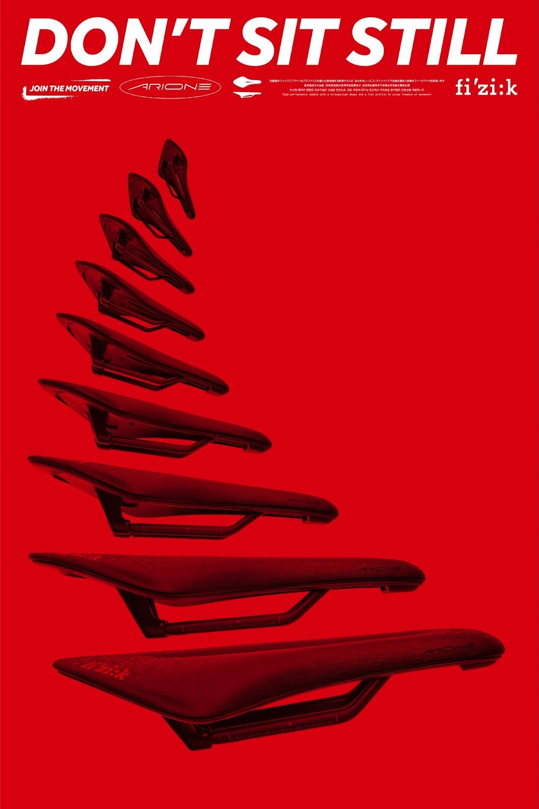 Arione reprend la plateforme « link » de la gamme de selles Aeris, permettant la fixation d’un porte-bidon arrière de type triathlon. Fizik prévoit d’autres options pour ce point de fixation afin de proposer ultérieurement des solutions de rangement alternatives sur le vélo. La nouvelle Arione se décline en 5 modèles, chacun déclinant une même forme et un même style de base pour répondre à différents besoins et budgets.
