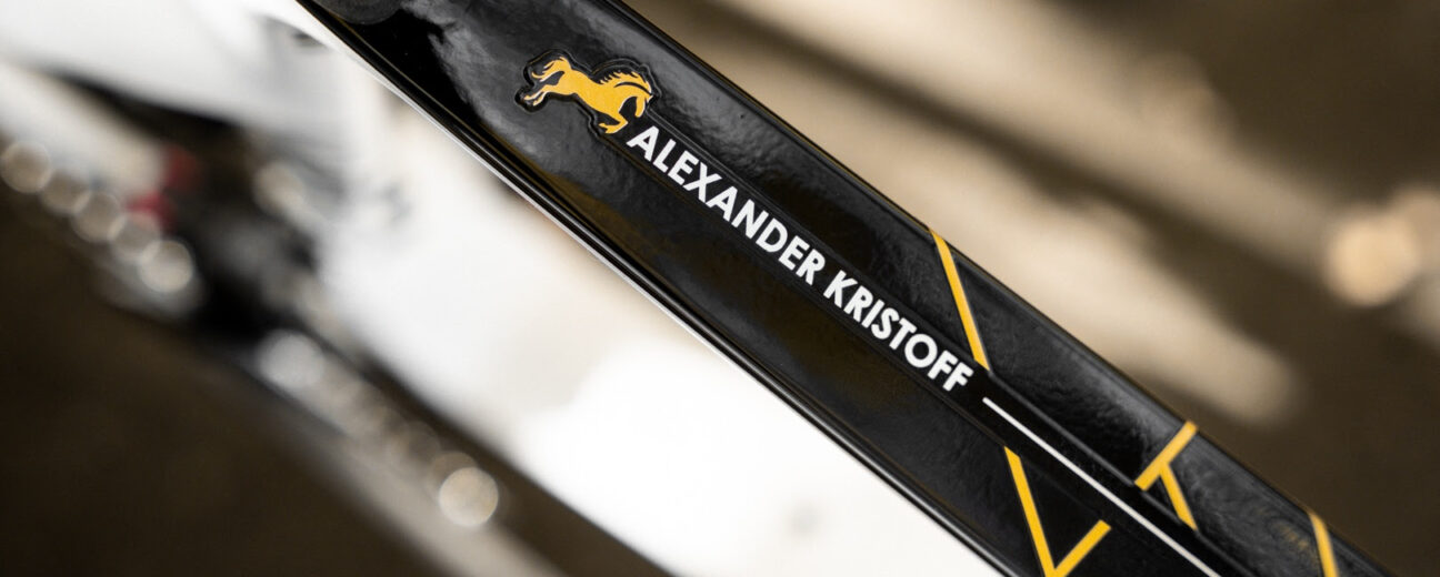 Le tube supérieur arbore un motif de cheval, en référence à son surnom, avec ses deux Monuments également inscrits. Le tube de selle rend hommage à ses titres nationaux norvégiens ; le tube de direction fait référence à sa médaille de bronze olympique et à Gand-Wevelgem. Le hauban liste ses victoires d’étape sur le Tour et son titre européen de 2017. Enfin, la livrée est un hommage à Lamborghini, une marque dont Kristoff est un grand fan.