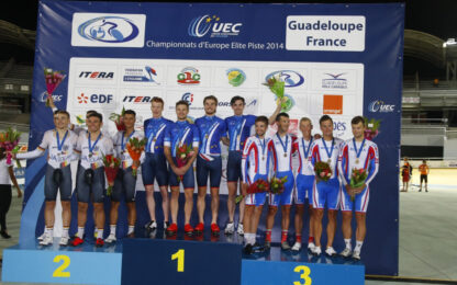 Championnats d'Europe à Baie-Mahault. Baugé, D'Almeida et Sireau s'emparent de l'argent en vitesse par équipes. La seule médaille française...