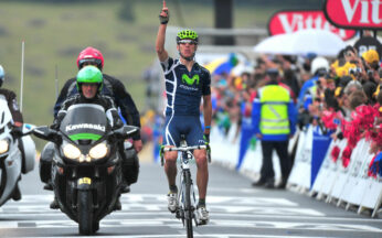 Tour de France # 8. Echappé depuis les tous premiers kilomètres de course, le Portugais Rui Costa lève les bras à Super-Besse Sancy. Hushovd reste en jaune.
