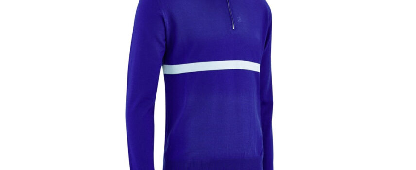 Le modèle Porticcio 69 de chez Louison Bobet, un pull maille fine, léger, et réalisé en laine 100 % mérinos, a été conçu comme le replica d'un maillot cycliste vintage.